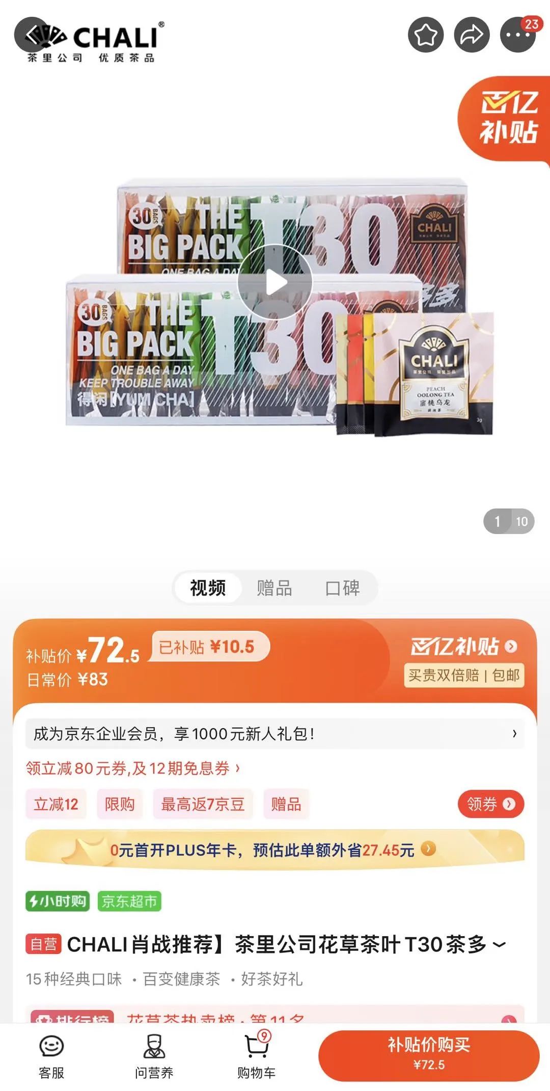 在京东旗舰店,“肖战推荐”的T30花草茶产品由15种口味30个茶包组合而成,净含量96g,补贴后价格为72.5元,净含量3.2g的单包定价为2.42元。