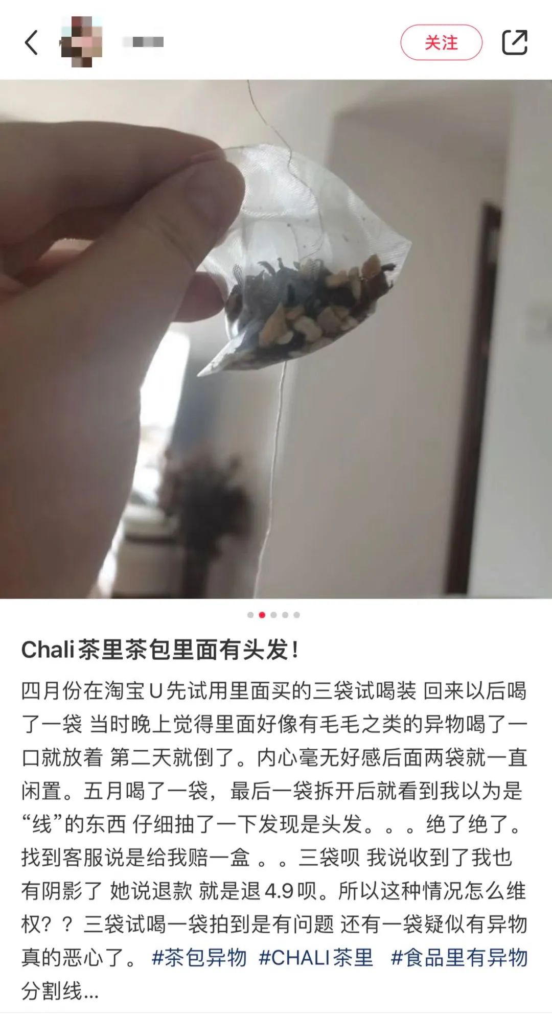 即便是在工厂投产两年后的今天,CHALI的品控能力也难言乐观。在各大社交平台,不乏用户吐槽CHALI茶包内含有异物的情况。