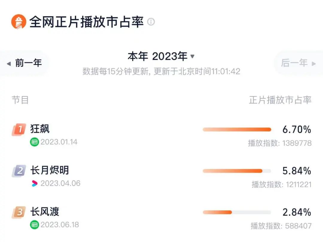 总播放量提升的同时,2023年上半年的国剧市场也有了近几年数据最好的剧王《狂飙》。德塔文、灯塔专业版、猫眼专业版、云合数据……基本上所有的数据平台,《狂飙》都是毫无疑问的第一。在云合数据的脱水统计里,《狂飙》也是在《庆余年》后又一部“百亿播放量俱乐部”的成员。
