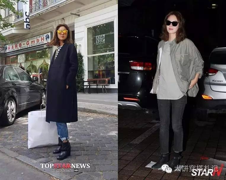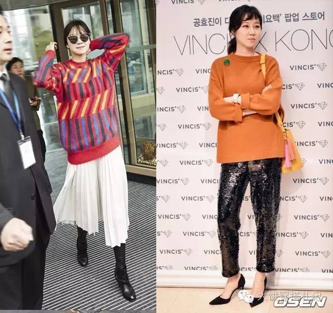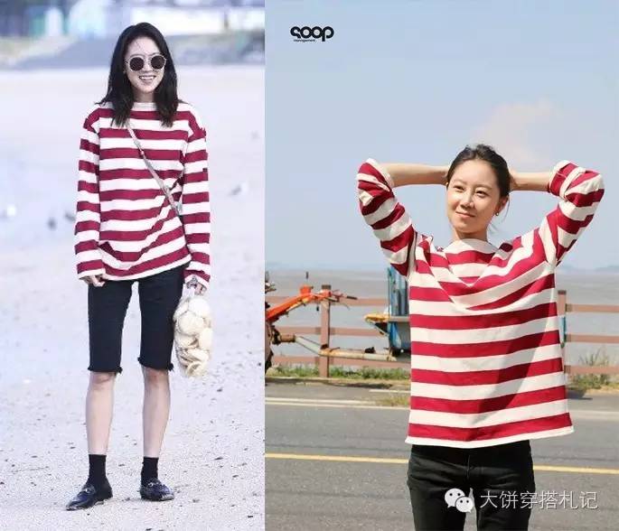 到了休闲时分的孔孝真还擅长用oversized上衣突出自己的大长腿,并且减龄。比如在海边,就用了紧身的skinny短裤与条纹大T恤搭配,看起来舒适又上镜。