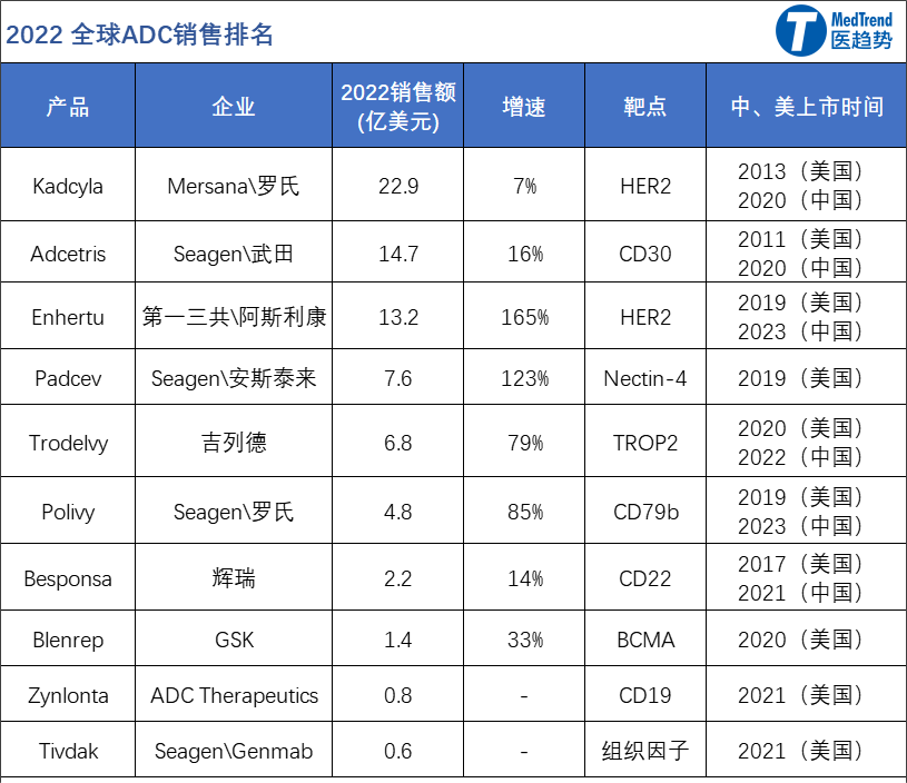 从2022年最新销售额来看,排名第一的罗氏制药Kadcyla销售额约23亿美元。