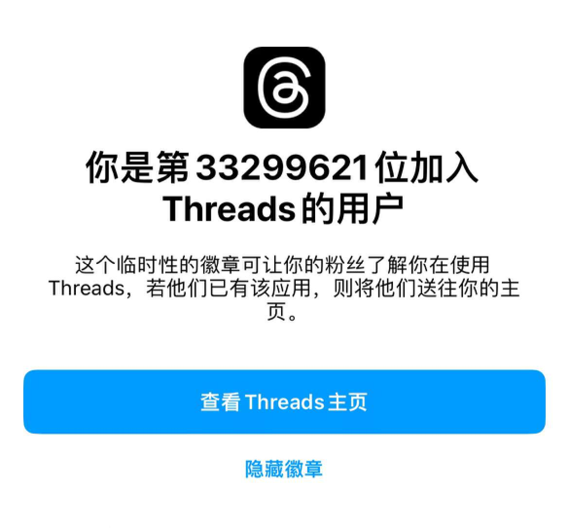 实际上,Threads上线5天注册用户破1亿,这个数据并非空穴来风。因为其注册用户的Instagram主页会获得“临时性徽章”,展示其加入Threads的排名。