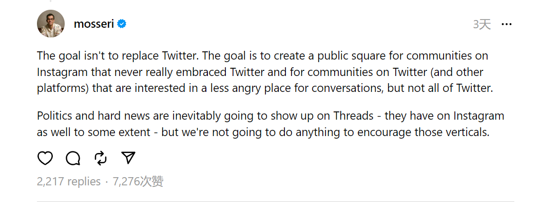 有网民指出,Threads是“Twitter杀手”,但Adam Mosseri在接受科技媒体The Verge采访时表示,Threads的目标不是取代Twitter,他们想要创建一个较少愤怒的公共对话广场,同时不会采取措施鼓励政治和硬新闻的内容。