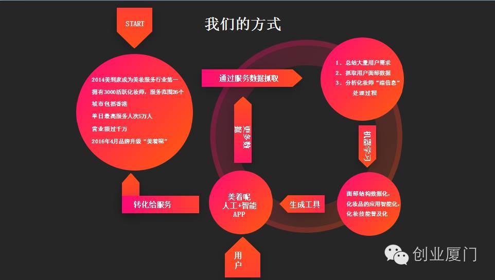 “美着呢”有15万的化妆师,这个要非常感谢于我们A轮股东提供了非常强大供应链的资源。通过上门化妆服务近200万用户,“美着呢”总结了大量用户需求,通过抓取用户面部数据,分析化妆师“暗信息”处理过程,做了一款神奇的工具,它会干嘛呢?