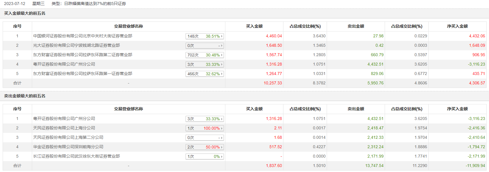 具体来看,粤开证券广州分公司、天风证券上海分公司分别卖出4432.51万元、2418.47万元;中国银河证券北京中关村大街证券营业部、光大证券宁波钱湖北路证券营业部分别买入4460.04万元、1648.50万元。