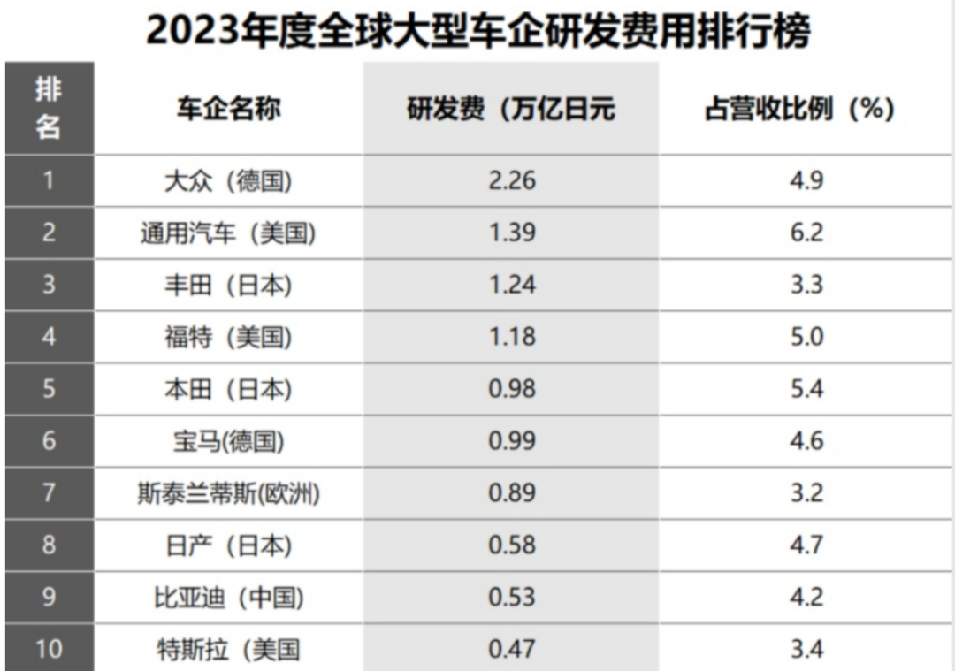 需要说明的是,丰田的研发占比在全球排名前十中倒数第二,仅高于泰斯兰蒂斯的3.2%,而低于比亚迪的4.2%和特斯拉的3.4%。