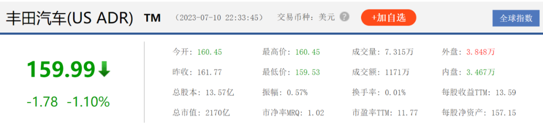 所以丰田在官宣电池技术有突破后,并未引发投资者信心,7月10日盘中,丰田股价再度下跌1.10%,总市值为2170亿美元,市值跌幅近30亿美元。