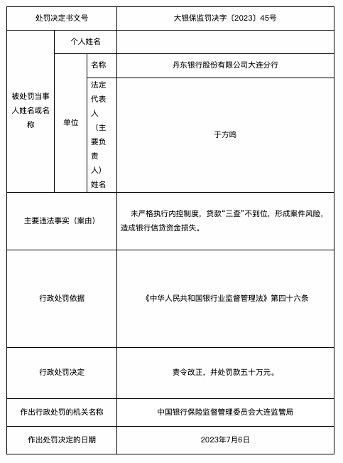 7月13日,国家金融监督管理总局公布的行政处罚信息公开表显示,2023年7月6日,丹东银行股份有限公司大连分行因未严格执行内控制度,贷款“三查”不到位,形成案件风险,造成银行信贷资金损失,被责令改正,并处罚款五十万元。