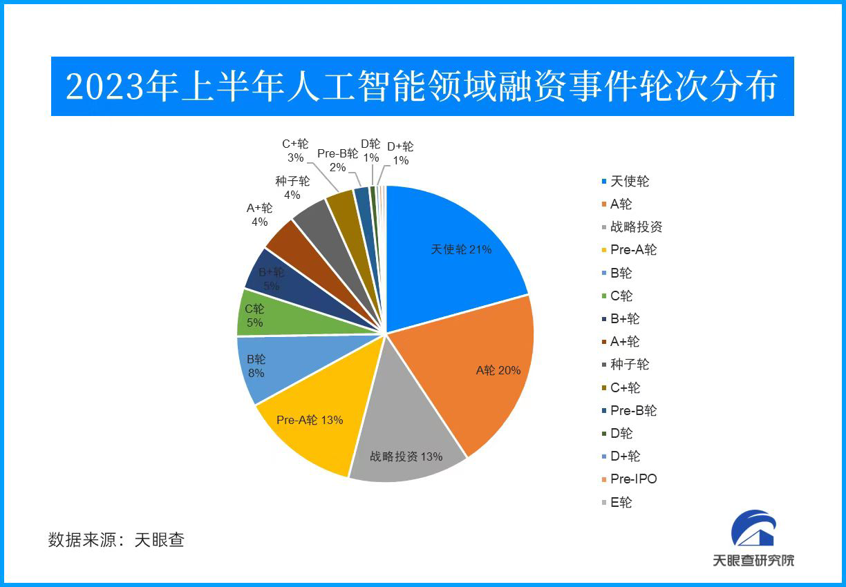 从2023年上半年的融资事件的轮次分布来看,天使轮、A轮以及战略融资事件数量位居前列,分别拥有59、57以及38起。