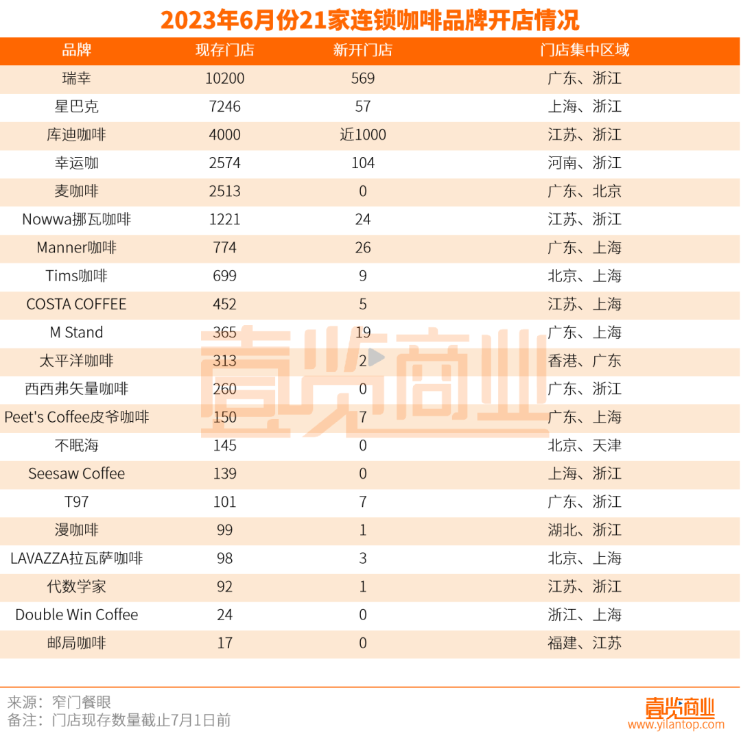 6月份,壹览商业长期跟踪观察的国内21家连锁咖啡品牌新开门店与上月相比增加869家。