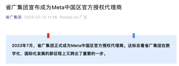 7月13日,据省广集团消息,2023年7月,省广集团正式成为Meta中国区官方授权代理商。