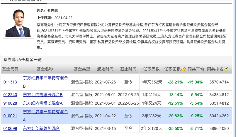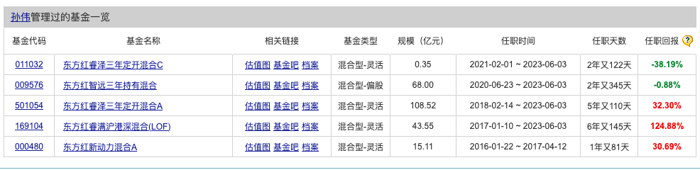 孙伟另外两只收益为正的基金分别是东方红新动力混合、东方红睿泽三年定开混合,任期内收益率分别为30.69%、32.30%。