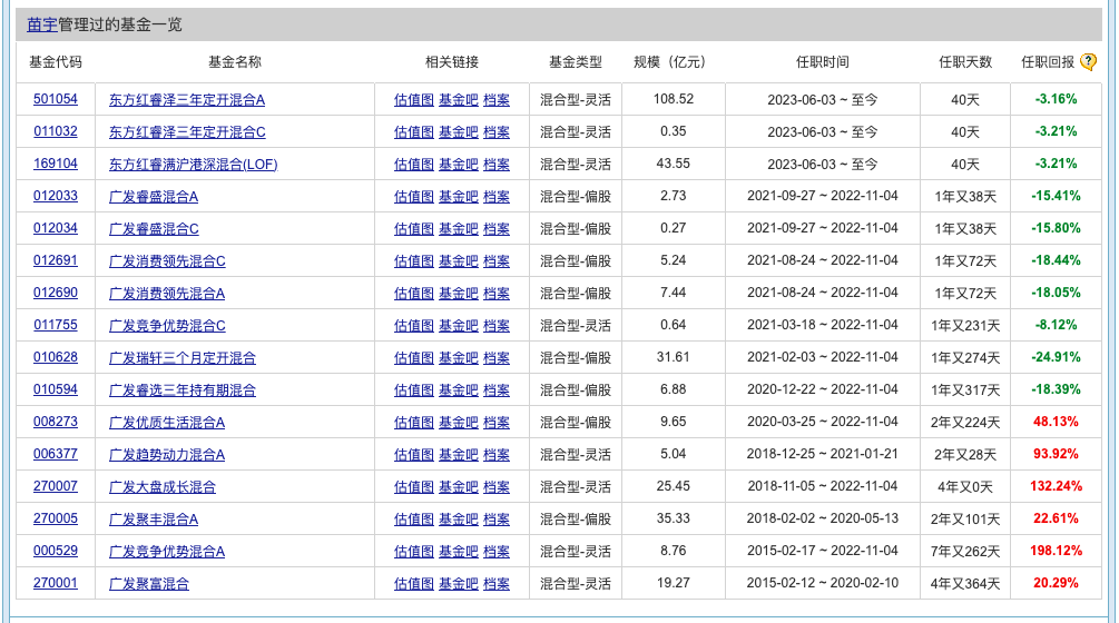 比如接任孙伟成为东方红睿满基金经理的苗宇,此前在广发基金任职,截至目前基金投资年限7.8年,年化回报率9.56%。苗宇管理的基金中业绩表现好的主要集中在2020年前接手管理的基金,2020年末以来接管的基金都未能获得正收益率。