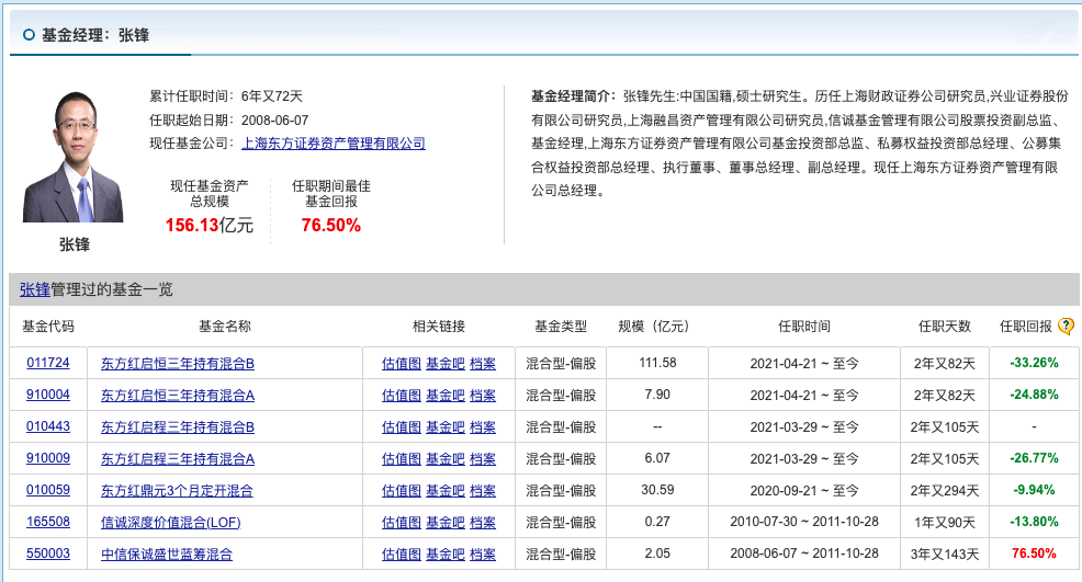 资料显示,王锋有23年证券从业经验,复旦大学经济学硕士,基金管理年限6.2年,当前管理规模156亿,任职年化回报率6.45%。单看年化回报率,王锋的投资业绩显然不如陈光明、林鹏等人。