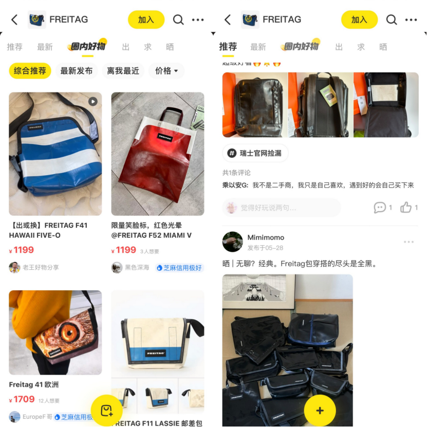 最近,剁主竟然在闲鱼发现了FREITAG的社交圈,越来越多早已不是小众时尚的年轻打工人、学生开始入坑,甚至成为铁粉,衍生出更多的“F门人”。