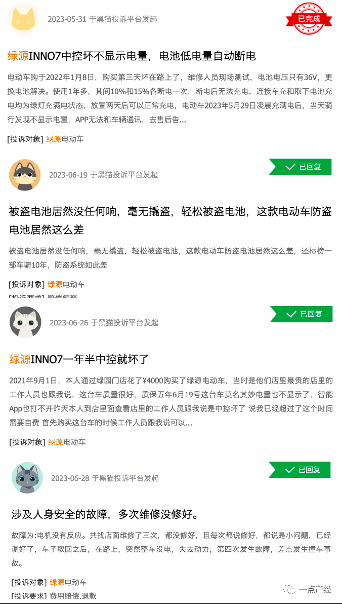 《一点产经》在黑猫投诉上发现,绿源电动车防盗系统、中控系统、电机等均存在投诉,这些均是绿源需要重视的,尤其在产能爬坡期。
