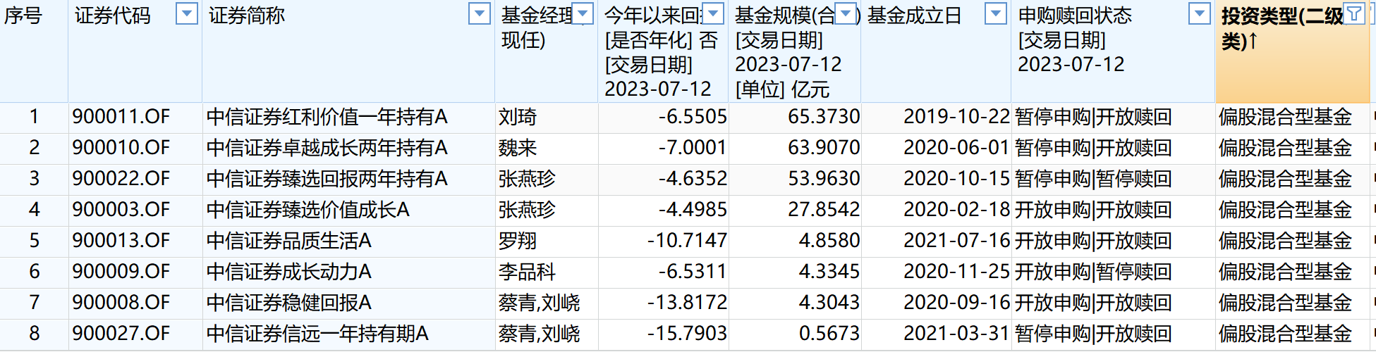 其中,偏股混合型产品共计8只,基金规模合计225.16亿元。“中信证券红利价值一年持有A”、“中信证券卓越成长两年持有A”和“中信证券臻选回报两年持有A”三只参公产品规模均在50亿元以上,在管基金经理分别为刘琦、魏来和张燕珍。