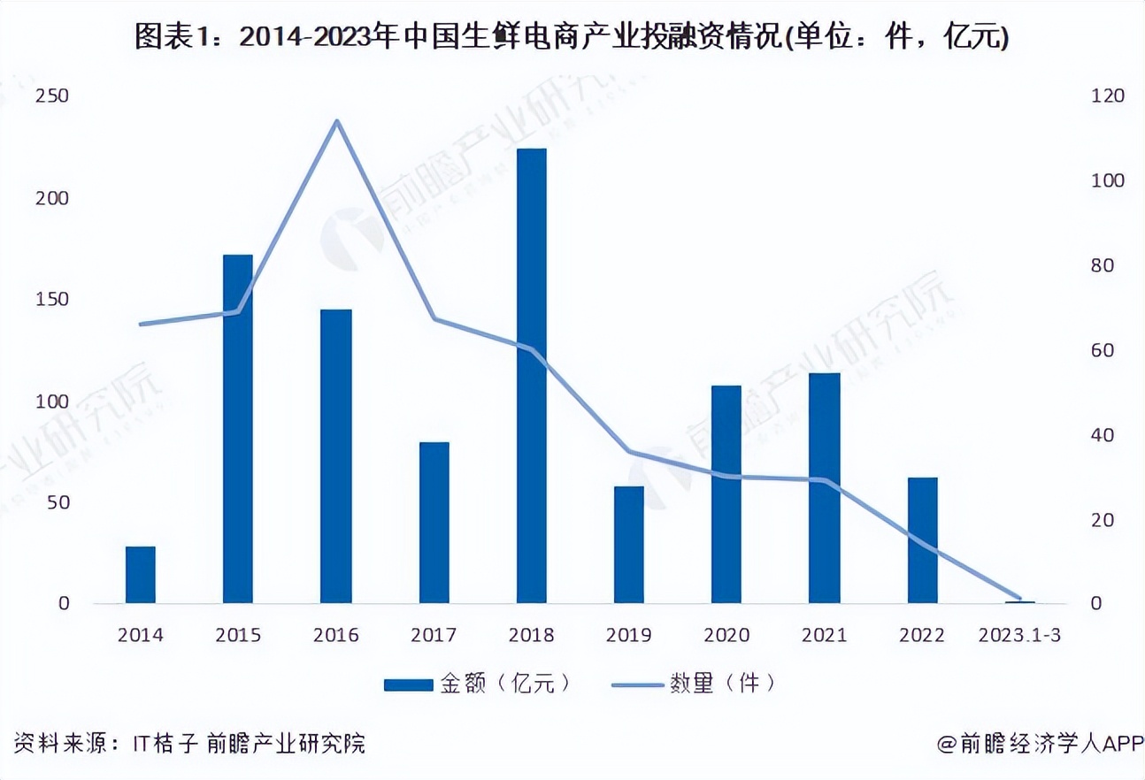 截至2023年3月28日,国内生鲜电商产业仅发生1例投融资事件,且投融资金额只有 0.3 亿元。