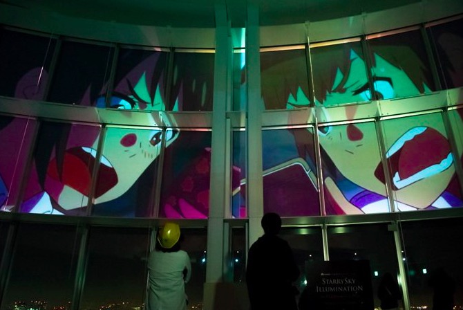 如果没赶上夏季和天然水的合作,又买不起电影同款周边的话,可以去体验下刚刚开放的《你的名字。》360°全景星空版。位于东京的六本木大楼展望台从今天(11月23日)起,在展望台的16面窗户上举办“星空触摸剧场”,放映的影片正是《你的名字。》,票价只需要1800日元(约人民币111元),还可以顺便欣赏东京夜景。