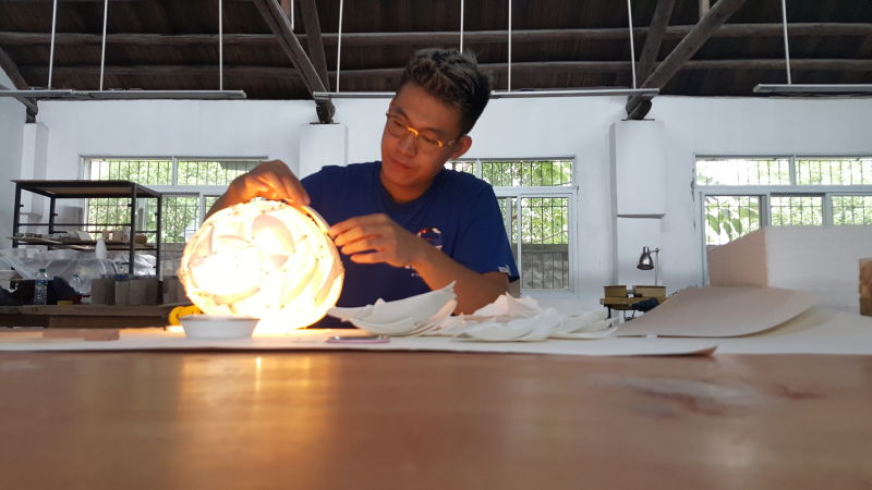 卫星展入围者尹祎和他的作品,这款灯由废弃的瓷器碎片打磨而成,呼吁人们重视环保和废物利用