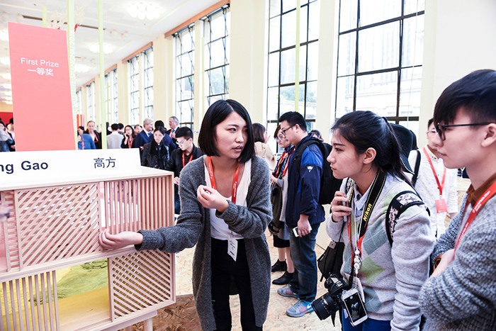卫星展一等奖获得者高方在介绍自己的获奖作品“In-between Dimensions”,该作品灵感来自于透过森林中树木的光影,是有着网格、淡淡色调和光影的储物柜