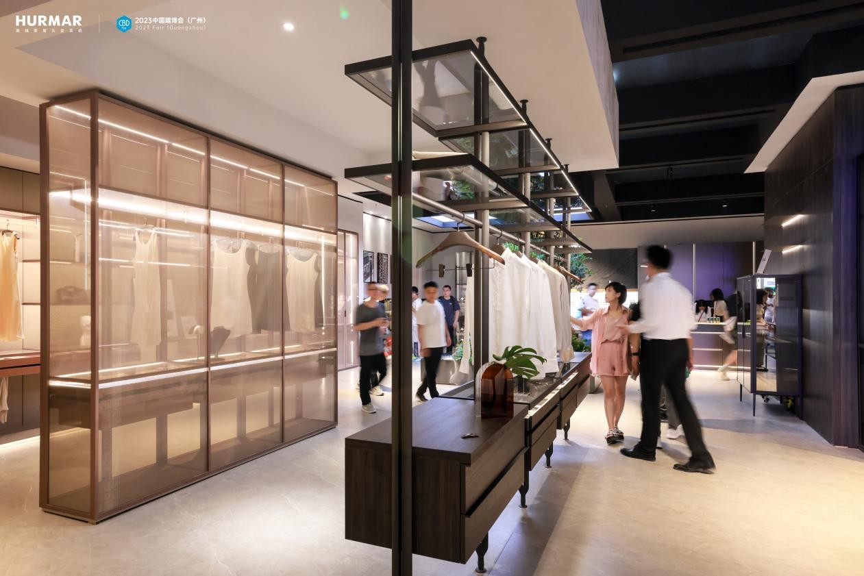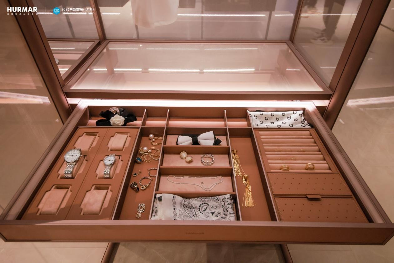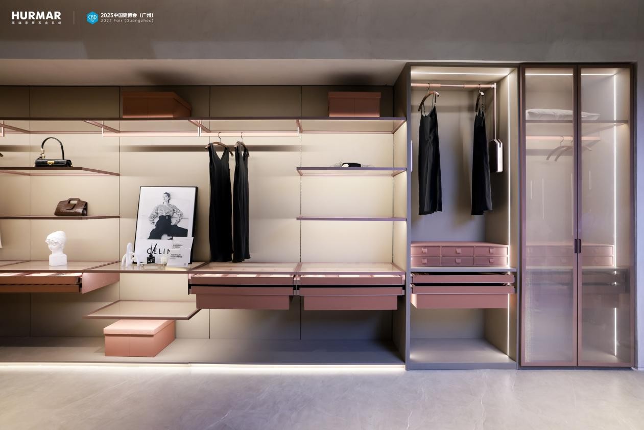 如全新红粉金壁挂衣帽间,正是基于女性主人视角,围绕女性体验及社交生活需求订制而来,诠释 HURMAR从行业定义走向用户定义的研发思路。