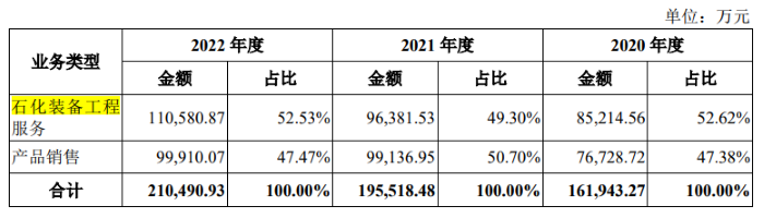 但界面新闻发现,公司另一项主营业务石化装备工程服务占国内行业市场份额并不高。报告期内,公司石化装备工程服务收入分别为8.52亿元、9.64亿元和11.06亿元,占主营业务收入的比例分别为52.62%、49.30%和52.53%。
