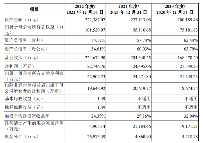 2020年至2022年(报告期),公司各项业务发展稳定,经营业绩稳步增长。报告期内,公司分别实现营业收入16.8亿元、20.4亿元和22.5亿元,净利润2.15亿元、2.45亿元和2.27亿元。