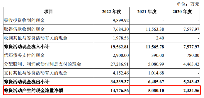 2022年现金分红金额较高也导致公司筹资活动产生的现金流量净额直接为负,由2021年的5080.10万元直接降至-14776.56万元。