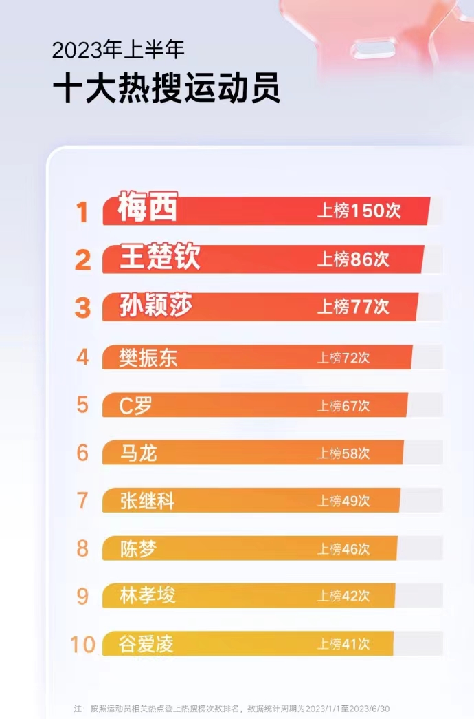 北京时间2023年7月13日,微博公布了2023年上半年的热搜趋势报告。其中,十大热搜运动员榜单上,得益于其火爆的中国行,梅西以150次的热搜次数高居榜首。王楚钦、孙颖莎分别以86次和77次的热搜次数位列二、三位。