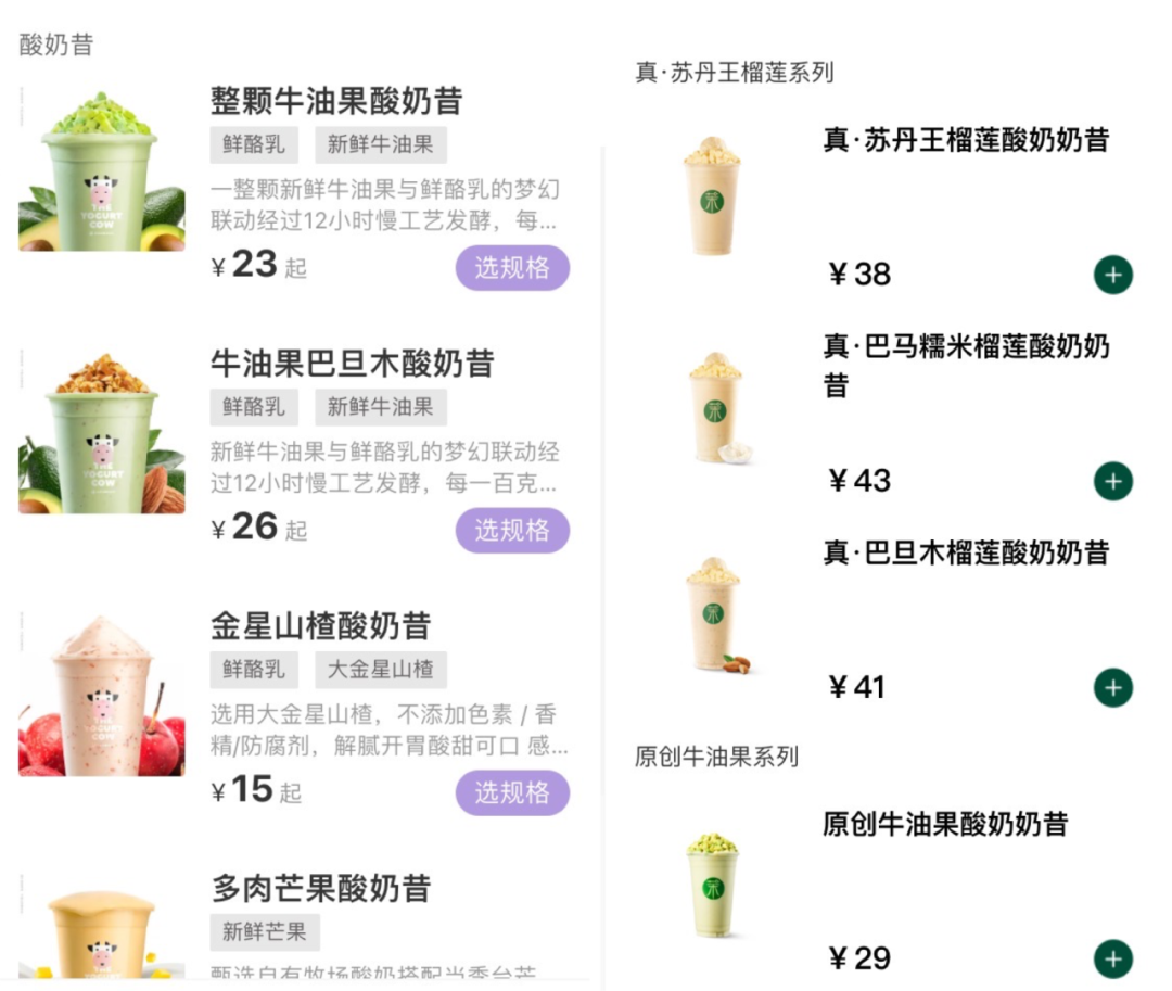 一只酸奶牛(左)和茉酸奶(右)的部分产品及其价格