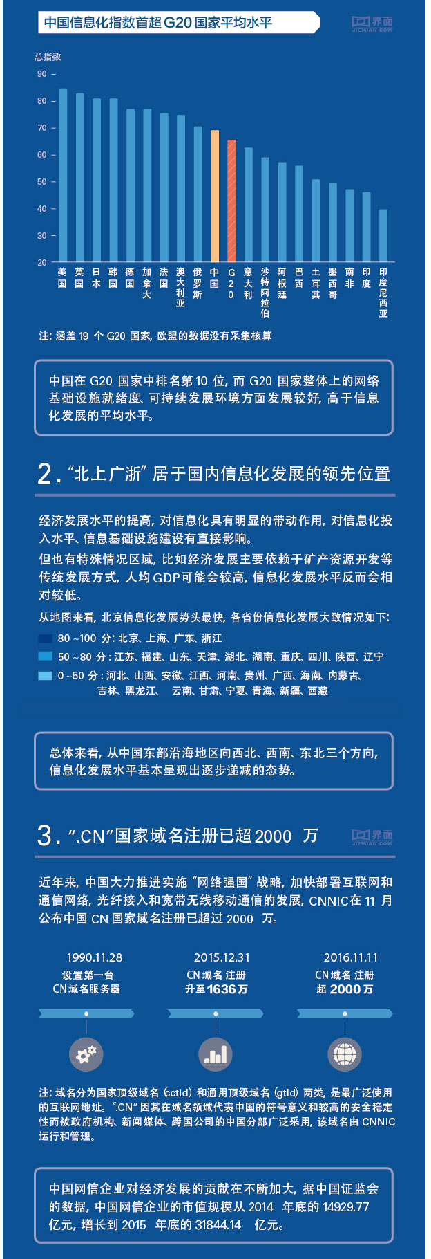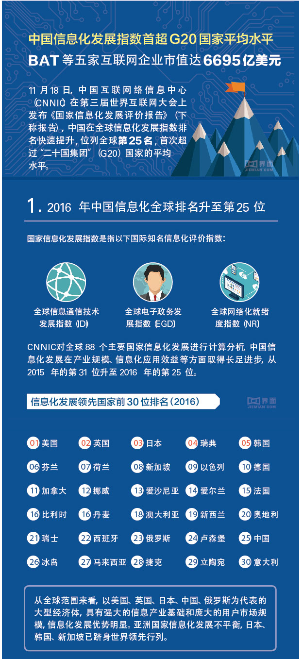 11月18日,中国互联网络信息中心在第三届世界互联网大会上发布《国家信息化发展评价报告》,中国在全球信息化发展指数排名快速提升,位列全球第25名,首次超过G20国家的平均水平。