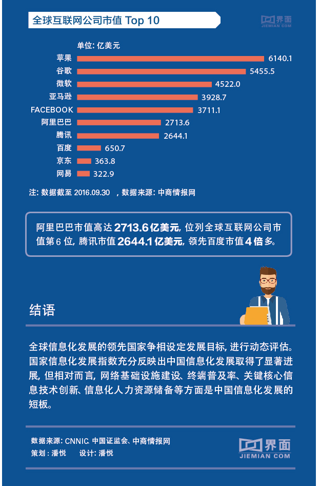 【图解】中国信息化指数首超G20国家平均水平 BAT等五家互联网企业市值达6695亿美元
