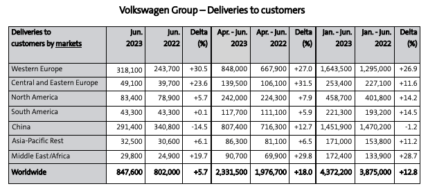 7月14日,大众汽车集团官网公布2023年6月交付量。6月,大众集团全球交付847,600辆,同比增长5.7%;其中,中国市场交付量为291,400辆,同比下降14.5%。1-6月,大众集团全球交付4,372,200辆,同比增长12.8%;其中,中国市场交付量为1,451,900辆,同比下降1.2%。
