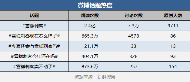 时至今年夏天,各大社媒上关于关于雪糕刺客的话题讨论仍然热烈。据不完全统计,在微博上,现存热度较高的相关话题累计阅读次数已超过2.6亿,讨论次数超7.8万,原创人数超1万人。