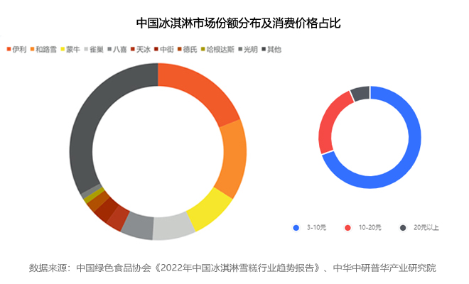 据中国绿色食品协会统计,2022年中国雪糕市场份额分布情况:伊利以21%的零售市场份额居首,联合利华、雀巢份额分别为10.5%、3.1%。目前国内,伊利、和路雪、雀巢、蒙牛构成第一阵营,线下渠道覆盖全国;大部分中高端雪糕市场仍由雀巢、哈根达斯等外资品牌占据,尽管钟薛高等网红品牌出现,搅动了整个市场,但短期内行业格局很难改变。