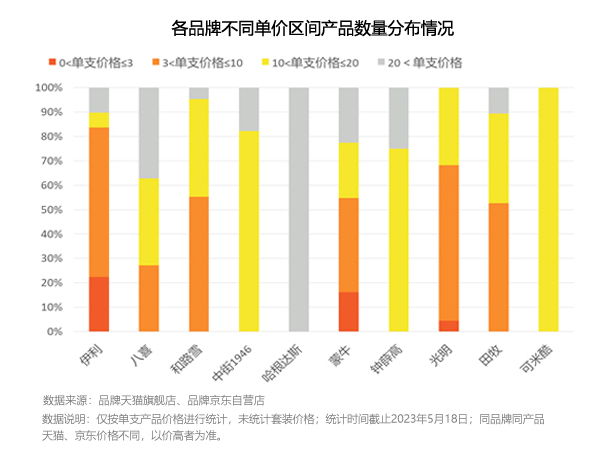 截止今年5月,市面上销售额TOP10的品牌中,中街1946、钟薛高、可米酷以10-20元的中高端产品为主,中街1946的全家福小白杯、钟薛高的杏余年与和你酪酪的大规格量贩装单价在20元以上。伊利凭借甄稀、蒙牛凭借蒂兰圣雪发力20元以上的高端市场。