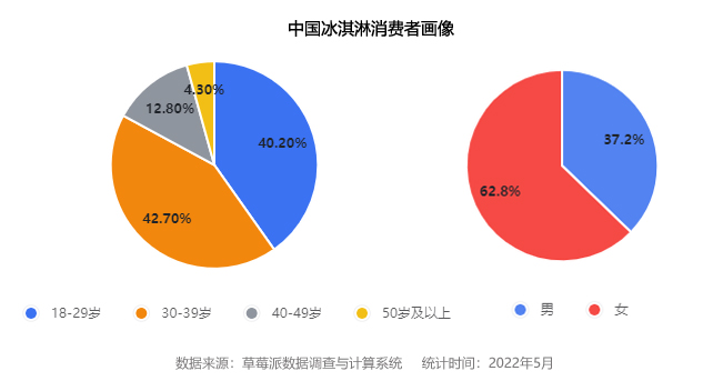 据统计,国内冰淇淋消费受众男女比例约为4:6,其中,30-39岁为主要受众,占比42.7%,18-29岁占比40.2%,40-49岁占比12.8%,50岁及以上占比4.3%。可以看出消费者集中在18-39岁的青年群体,品牌应抓住这部分年龄层人群的消费需求,对产品与营销策略上做出相应改变。