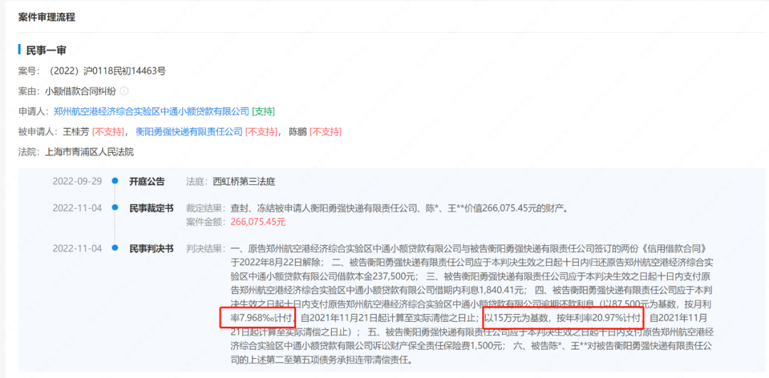 目前,中通小贷仅涉及22条司法案件。从裁判文书看,中通小贷放款利率不高,多在10%以下,而罚息利率则在20.97%左右,低于24%。
