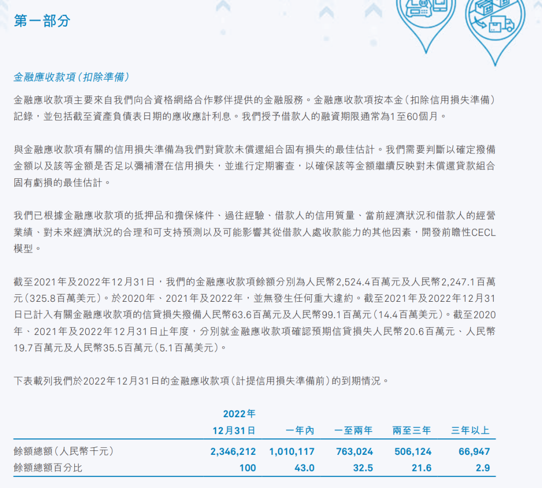 其中,金融应收款项主要来自中通快递向合资格网络合作伙伴提供的金融服务。金融应收款项按本金(扣除信用损失准备)记录,并包括截至资产负债表日期的应收应计利息。中通快递授予借款人的融资期限通常为1至60个月。