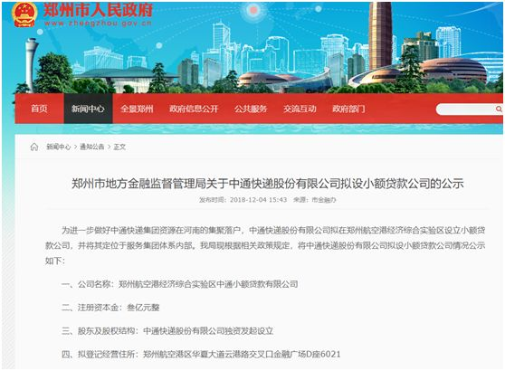 其中,小贷牌照无疑是含金量较高的一块。2018年12月底,郑州市人民政府官网曾发布《郑州市地方金融监督管理局关于中通快递股份有限公司拟设小额贷款公司的公示》,公示中通独资发起的小额贷款公司。随后的2019年1月,郑州航空港经济综合实验区中通小额贷款有限公司(以下简称“中通小贷”)正式成立。