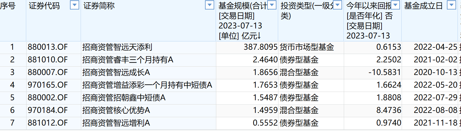 Wind披露,截至2023年7月13日收盘,招商资管7只在管大集合产品产品规模合计397.5亿元。然而,除一只巨额货基外,其余产品规模均不足3亿元。