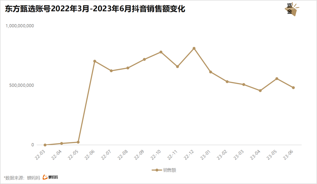再看具体销售额。抖音超头的保质期普遍最长半年,但东方甄选的带货能力并未随着时间推移而下降,反而历久弥坚。