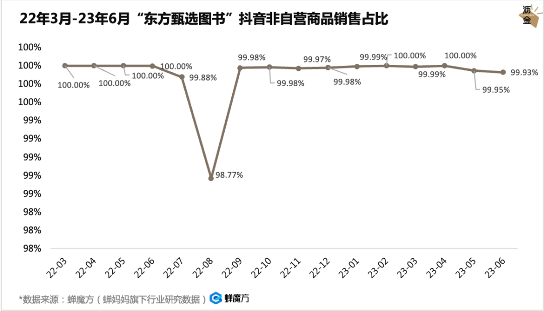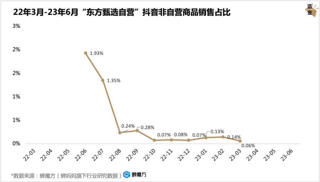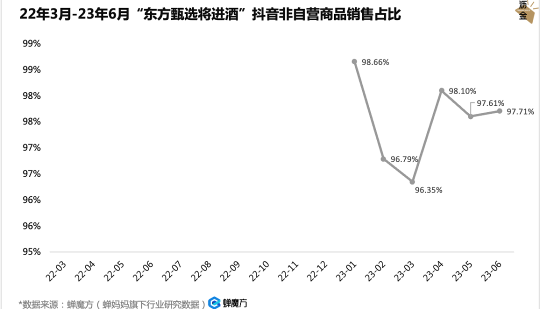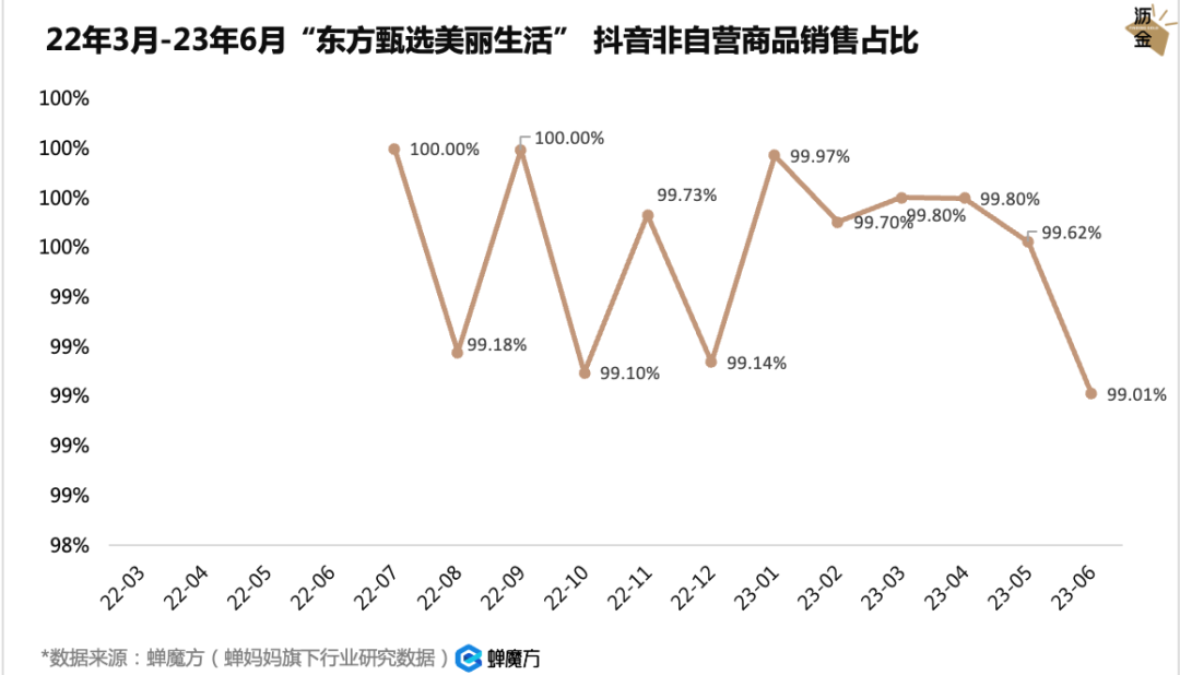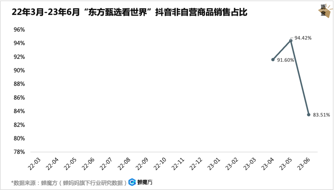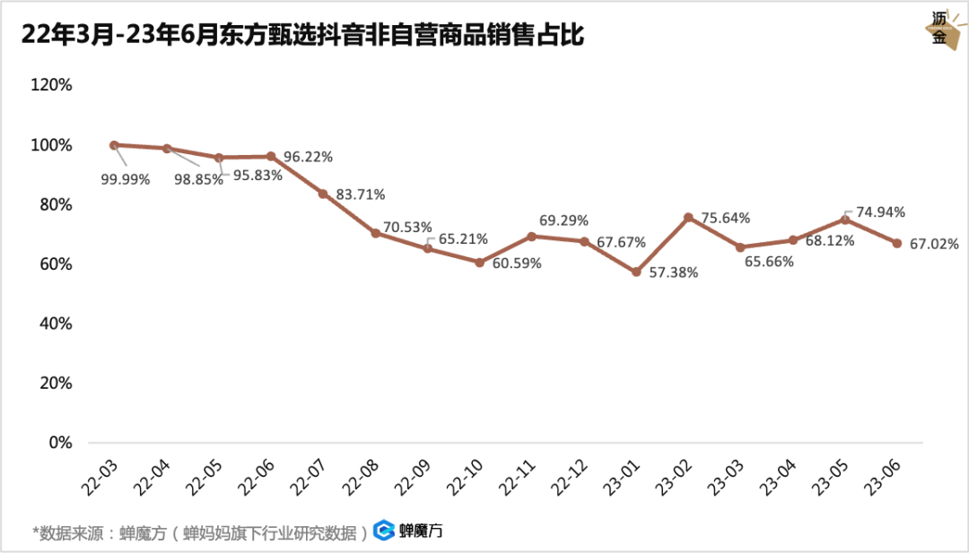 如果统计2022年3月-2023年6月东方甄选抖音非自营商品的销售占比,会发现非自营的商品比例持续下降,而自营商品从最开始的0逐渐上升到约40%。