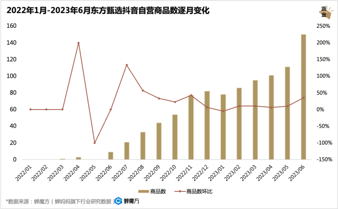 从2022年6月至今,东方甄选的自营商品数始终以一个相对平稳的速度增长,目前已经将近160款一个月。