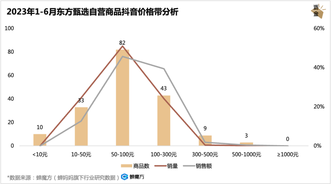 从价格带来看,东方甄选的自营商品区间以50-100元、100-300元为主,合计贡献了80%以上的销售额。