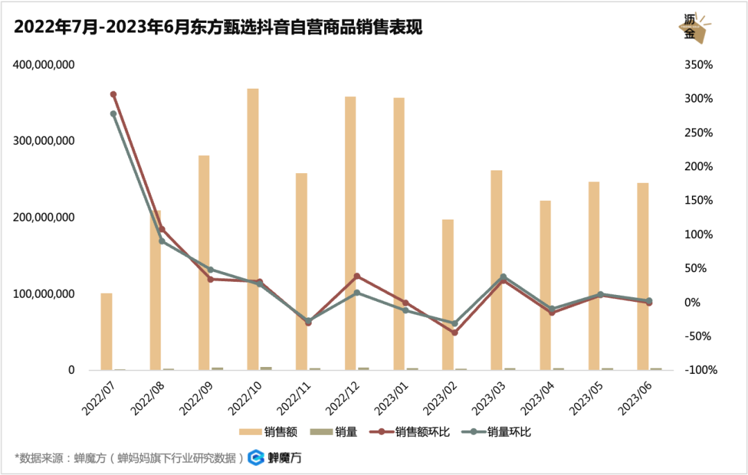 纵观其从2022年3月至2023年6月的抖音销售额,可以看到从去年6月起,东方甄选的带货水平一直稳居高位,但今年以来有明显下滑趋势。