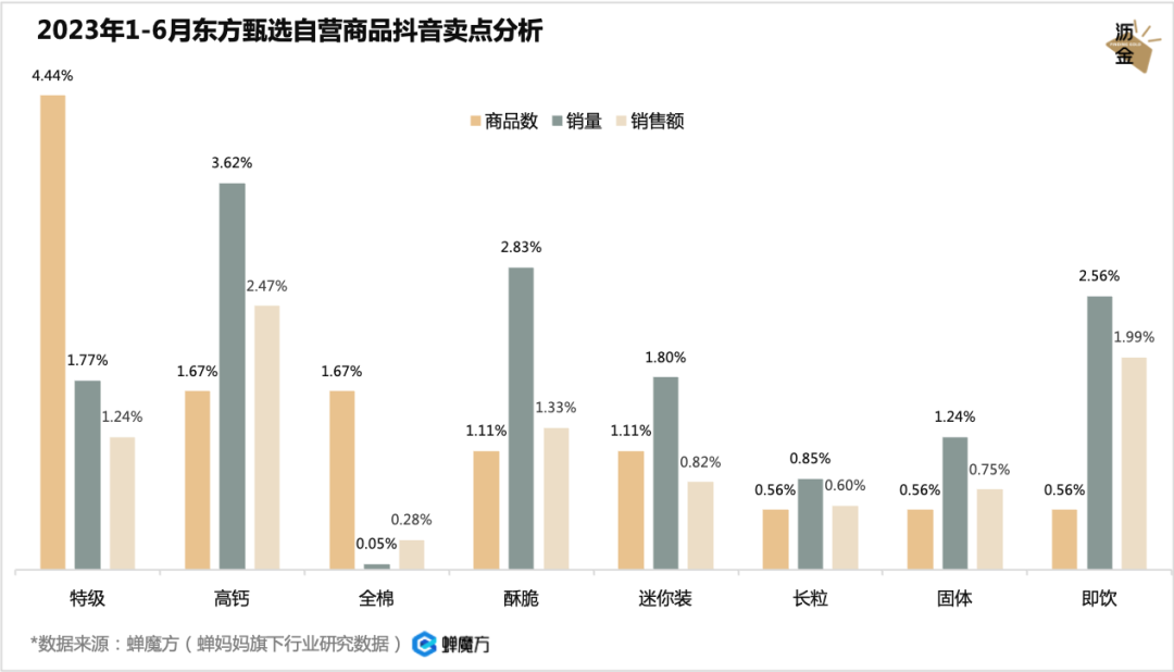 从卖点角度看,“特级”“高钙”“全棉”等主流标签,意味着东方甄选的消费者较为看重商品品质,对于价格或者性价比的重视程度较低,更多是出于改善生活方式的需要。
