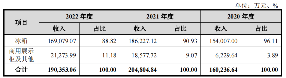 目前,冰箱、商用展示柜及其他品类,共同构成了雪祺电气主营业务收入,其中冰箱业务是公司主要营收来源,数据显示,2020~2022年,公司冰箱收入分别为15.4亿元、18.62亿元、16.91亿元,分别占总营收的96.11%、90.93%、88.82%。