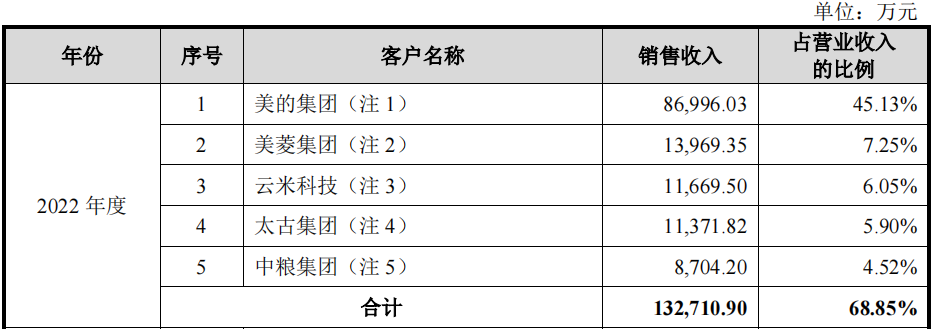 作为一家专注ODM生产制造商,雪祺电气能够实现业绩快速增长,离不开与客户建立长期稳定的合作关系。数据显示,近三年,公司前三大客户分别是美的、美菱、云米,近两年来,公司前五大客户还包括太古集团与中粮集团。此外,近三年,公司前五大客户营收总计分别为12.85亿元、14.92亿元、13.27亿元,分别占总营收的79.63%、72.02%、68.85%。